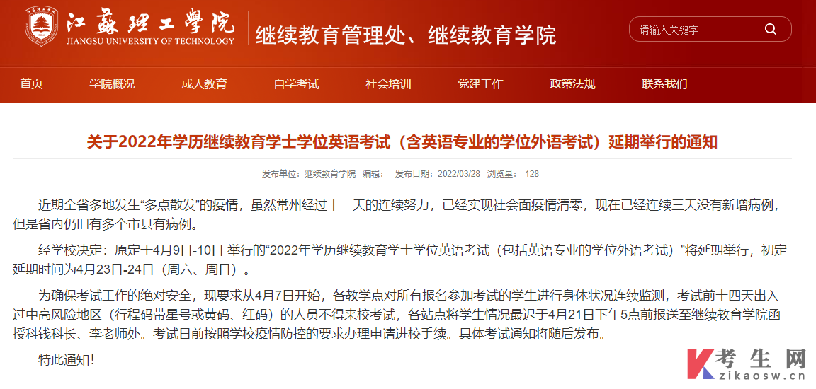 经学校决定:原定于4月9日-10日举行的“2022年学历继续教育学士学位英语考试(包括英语专业的学位外语考试)”将延期举行,初定延期时间为4月23日-24日(周六、周日)。