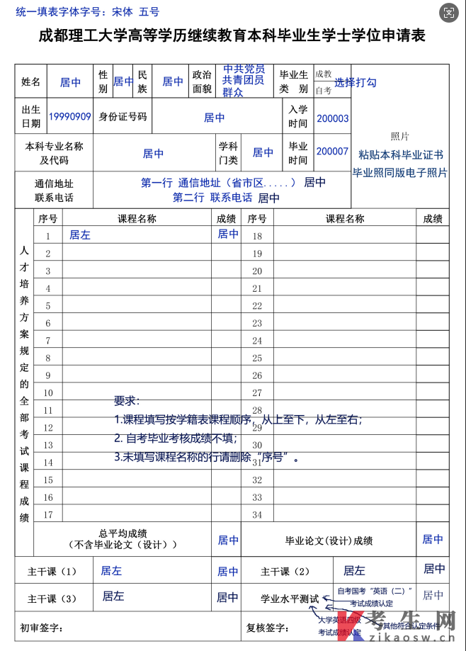 成都理工大学学士学位申请表填写模版