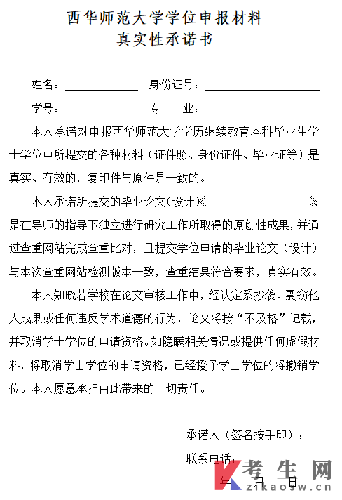 本人承诺对申报西华师范大学学历继续教育本科毕业生学士学位中所提交的各种材料(证件照、身份证件、毕业证等)是真实、有效的,复印件与原件是一致的。