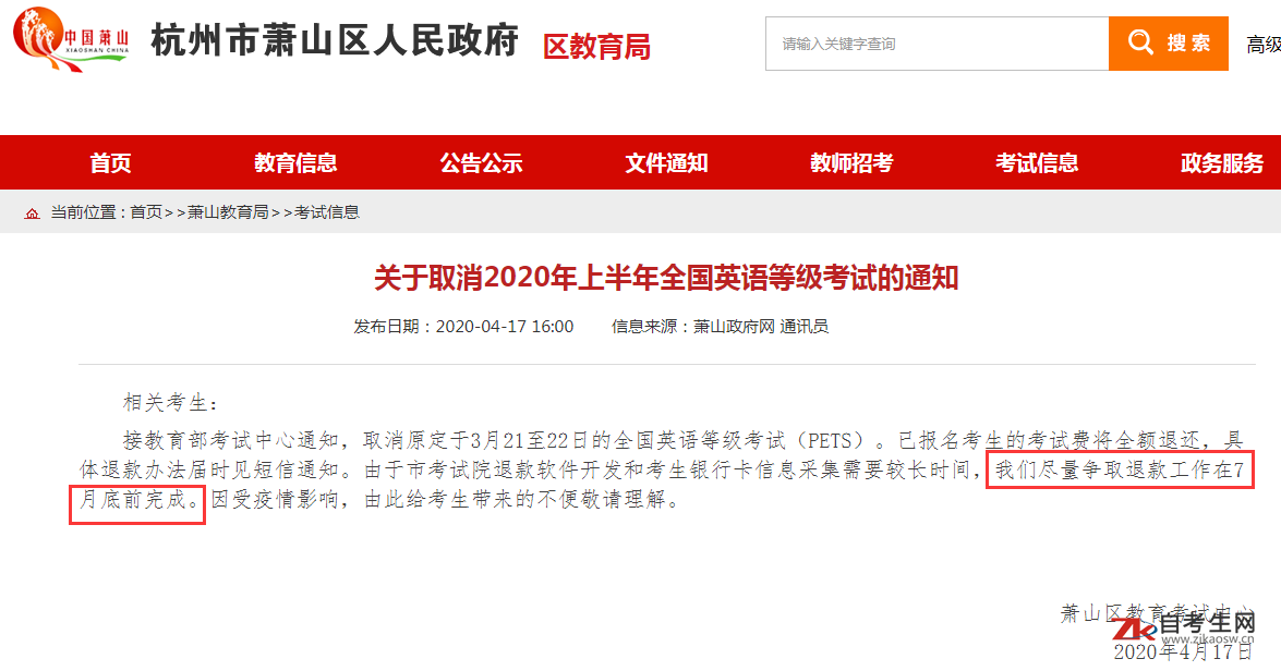 “2020年3月萧山公共英语三级考试取消,退款将于7月底前完成”由自考生学位网收集整理。