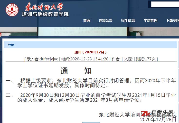 一、 根据上级要求,东北财经大学目前实行封闭管理,因而2020年下半年学士学位证书延期发放,具体时间待定。